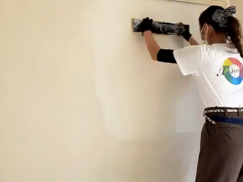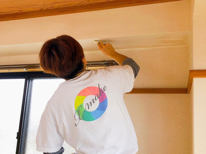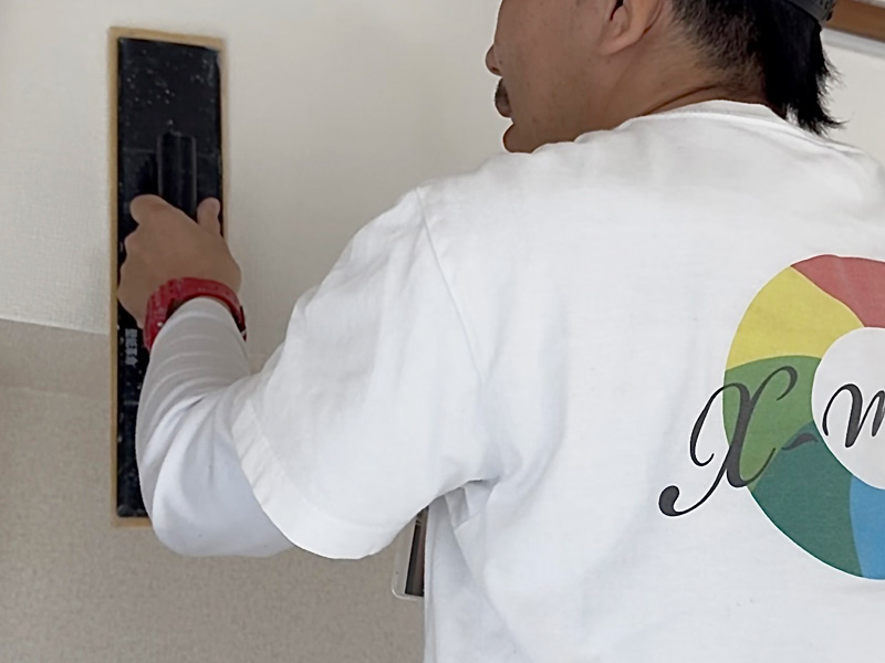 クロスメイクとは壁紙(クロス)にお化粧(メイク )をしていくような施工方法で、独自開発された水性の塗料を専用の刷毛で均一に素早く塗装していきます。
